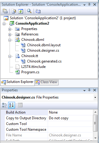 Now, look in Solution Explorer at the .tt file. If you're using C#, you'll have a sub .cs file, or if you're using VB, a sub .vb file. That's the file that will hold the result of the generation. This is the same visual metaphor used to the express the template/generated file relationship with .designer files you've seen elsewhere in Visual Studio. If you look in the Properties for the .tt file, you'll see it's using a CustomTool listed as the "TextTemplatingFileGenerator." This custom tool extensibility point is how things like XSD and WSDL code generators hook in to generate their artifacts.T4 can generate any kind of text file, not just code. You can use it in your projects, as above, or you can call T4 from the command-line. In the following example, I use Damien's T4 templates against the sample Chinook Database.