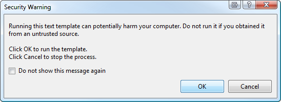 Now, let's start doing something with T4. go into Visual Studio and create a new Console(or any other type) Application and add a Text File. Then rename it something with a .tt extension. You'll get a warning. Click OK