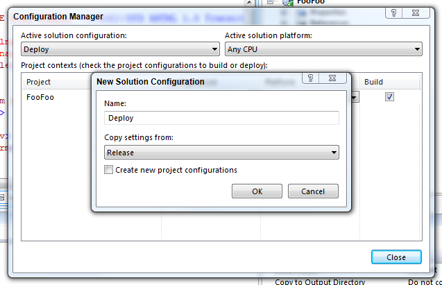 Make sure to create a Solution Configuration AND a Project Configuration, as they are different. Here I've made one called Deploy for the Project also. If you get an error message, be aware of the "Create new project configurations" checkbox. You might get a warning if you are making a new configuration and the dialog tries to make another configuration with the same name; uncheck the checkbox if that happens. Of course, you can have as many Configurations as you'd like.