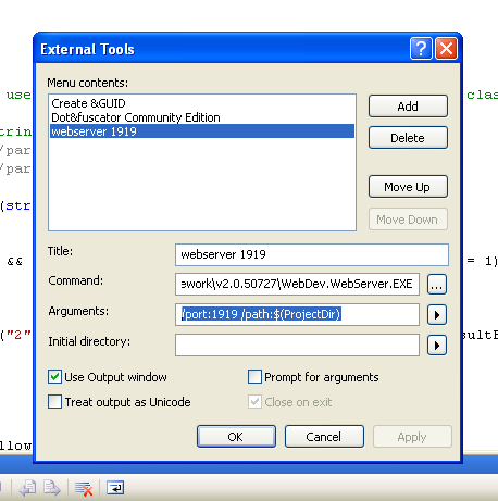 - In the command text box enter your .net web server address (in my computer it is C:\WINDOWS\Microsoft.NET\Framework\v2.0.50727\WebDev.WebServer.EXE)